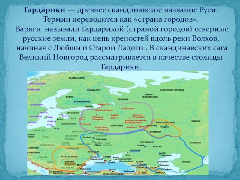 Слайд 34Гарда́рики — древнее скандинавское название Руси. Термин переводится как «страна городов».