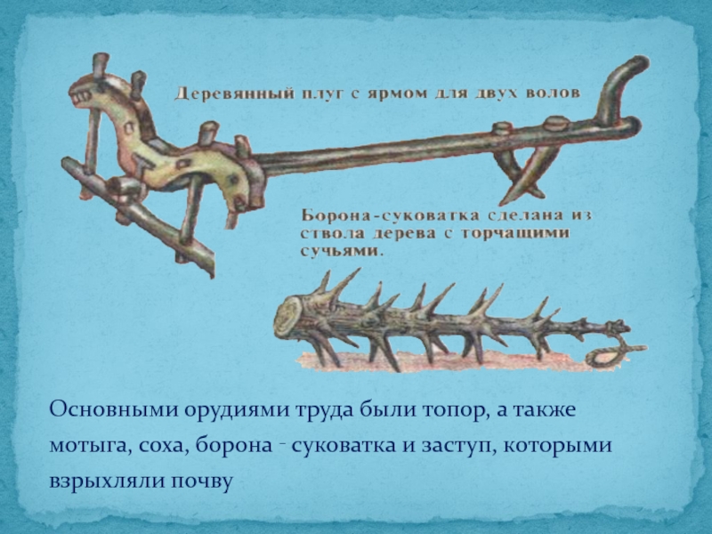 Слайд 15Основными орудиями труда были топор, а также мотыга, соха, борона ‑