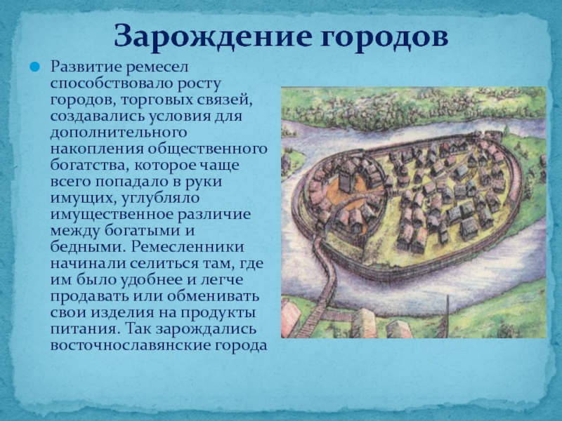 дополнительного накопления общественного богатства, которое чаще всего попадало в руки имущих, углубляло имущественное различие между богатыми и бедными. Ремесленники начинали селиться там, где им было удобнее и легче продавать или обменивать свои изделия на продукты питания. Так зарождались восточнославянские города