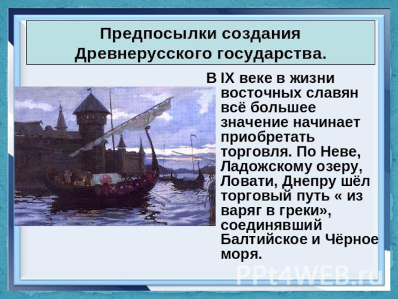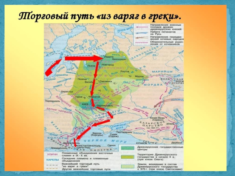 Черному морю и Днепру, затем суда волоком перетаскивали из Днепра в реку Ловать, впадающую в озеро Ильмень, из него путь продолжался по реке Волхов, соединяющей Ильмень и Ладожское озеро, или, как его называли в древности, озеро Нево. Оттуда путники попадали в реку Неву, соединяющую Ладожское озеро с Финским заливом, а уж затем по Балтике, или, как его называли. Варяжскому морю, отправлялись в сторону Рима