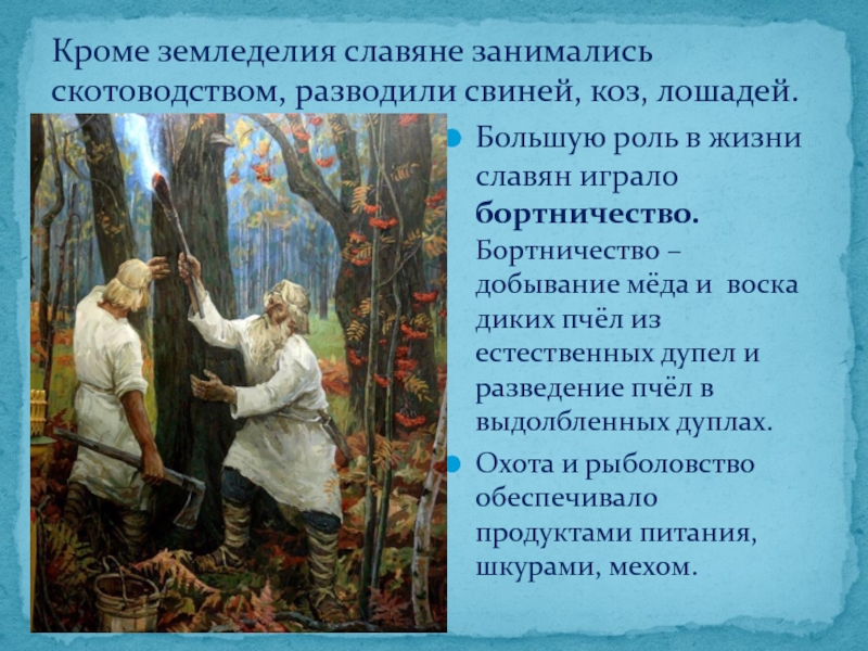 жизни славян играло бортничество. Бортничество – добывание мёда и воска диких пчёл из естественных дупел и разведение пчёл в выдолбленных дуплах.