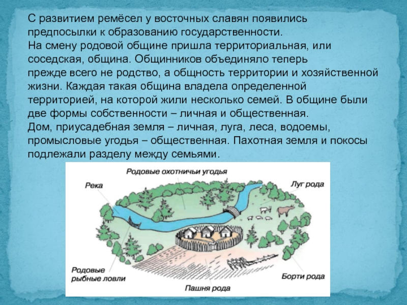 смену родовой общине пришла территориальная, или соседская, община. Общинников объединяло теперь прежде всего не родство, а общность территории и хозяйственной жизни. Каждая такая община владела определенной территорией, на которой жили несколько семей. В общине были две формы собственности – личная и общественная.