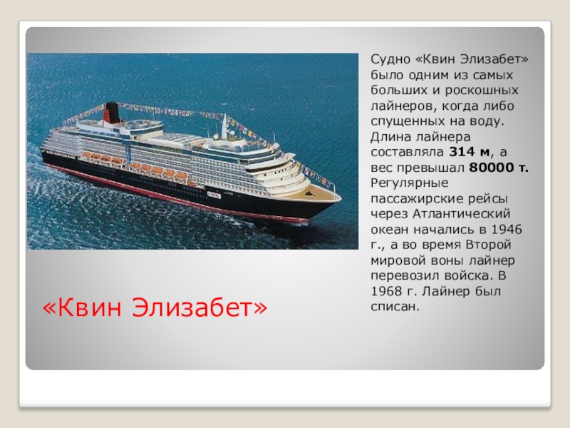 когда либо спущенных на воду. Длина лайнера составляла 314 м, а вес превышал 80000 т. Регулярные пассажирские рейсы через Атлантический океан начались в 1946 г., а во время Второй мировой воны лайнер перевозил войска. В 1968 г. Лайнер был списан.