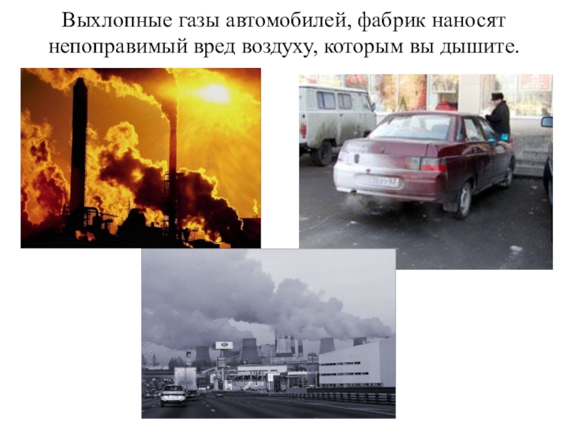 Слайд 14Выхлопные газы автомобилей, фабрик наносят непоправимый вред воздуху, которым вы дышите.