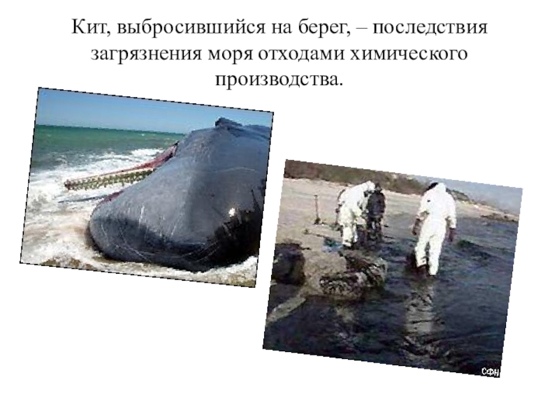 Слайд 12Кит, выбросившийся на берег, – последствия загрязнения моря отходами химического производства.