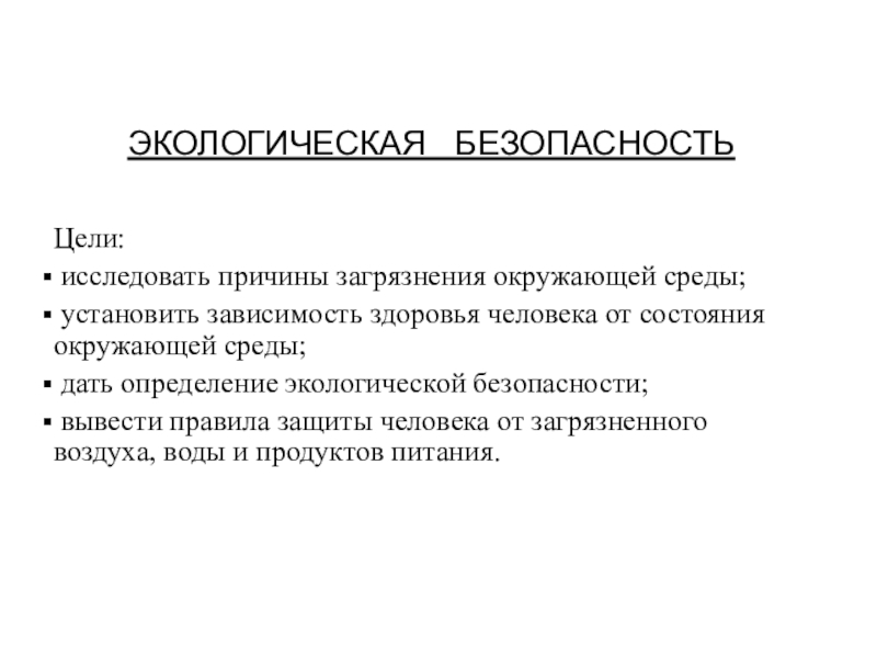 ЭКОЛОГИЧЕСКАЯ  БЕЗОПАСНОСТЬЦели: исследовать причины загрязнения окружающей среды; установить зависимость здоровья человека от состояния окружающей среды; дать