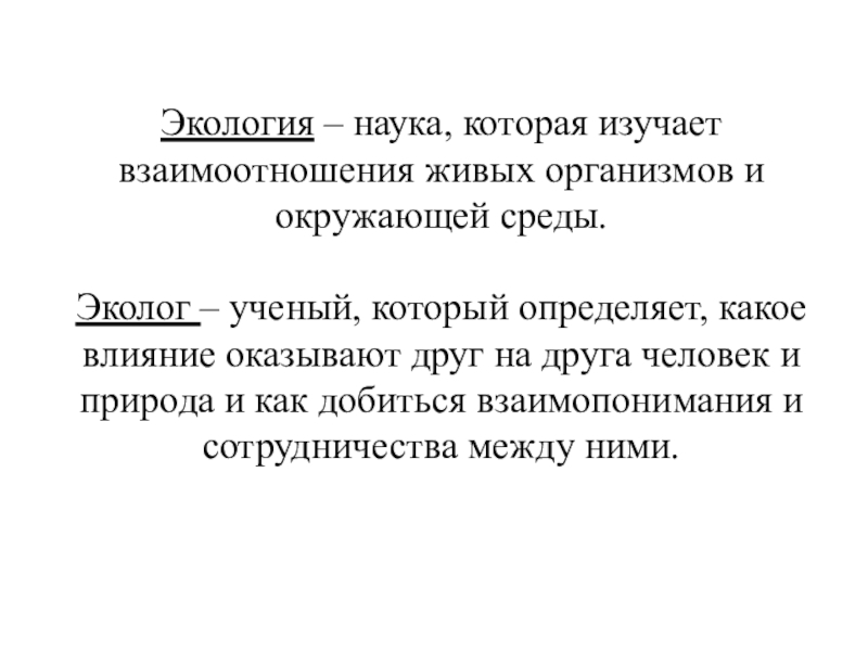Экология – наука, которая изучает взаимоотношения живых организмов и окружающей среды.  Эколог – ученый, который определяет,