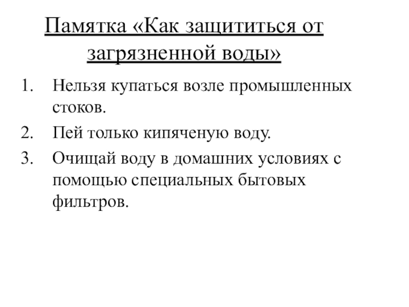 Памятка «Как защититься от загрязненной воды»Нельзя купаться возле промышленных стоков. Пей только кипяченую воду. Очищай воду в