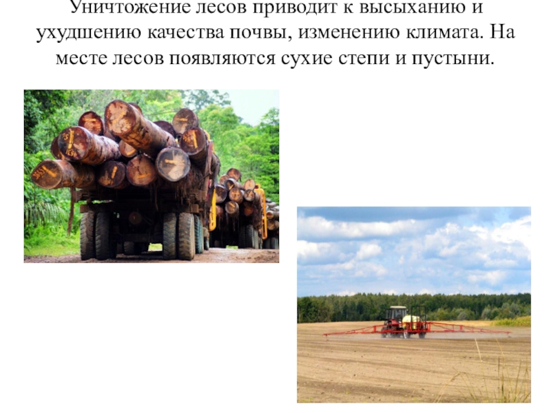 Слайд 15Уничтожение лесов приводит к высыханию и ухудшению качества почвы, изменению климата.