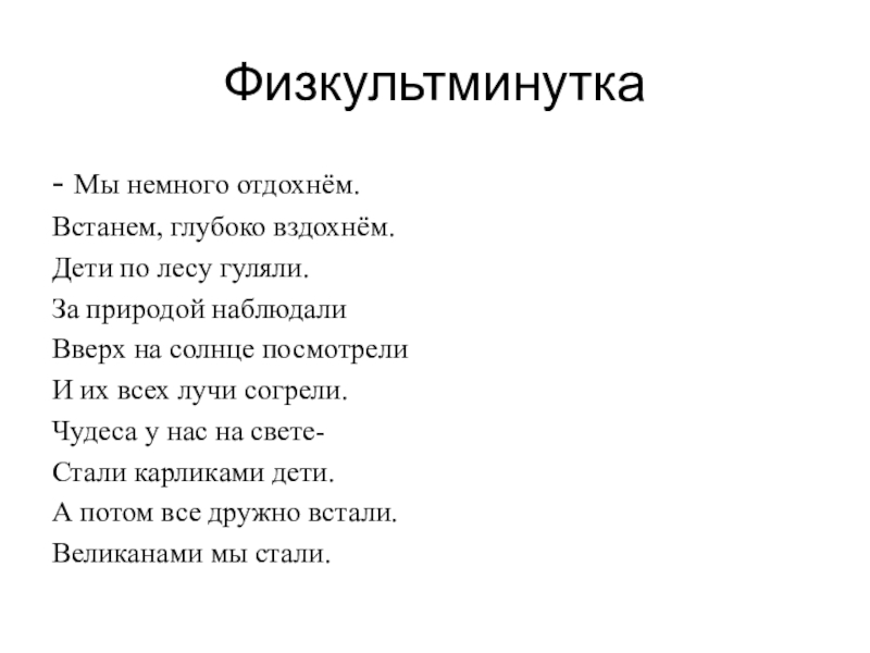 Физкультминутка- Мы немного отдохнём.Встанем, глубоко вздохнём.Дети по лесу гуляли.За природой наблюдалиВверх на солнце посмотрелиИ их всех лучи