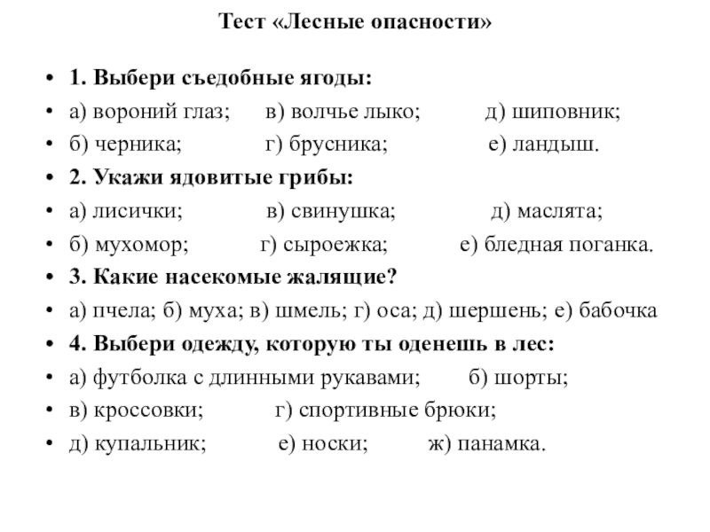 Тест «Лесные опасности» 1. Выбери съедобные ягоды:а) вороний глаз; в) волчье лыко; д) шиповник;б) черника; г) брусника;