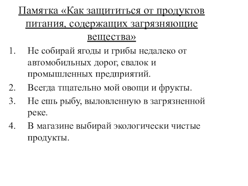 Слайд 24Памятка «Как защититься от продуктов питания, содержащих загрязняющие вещества»