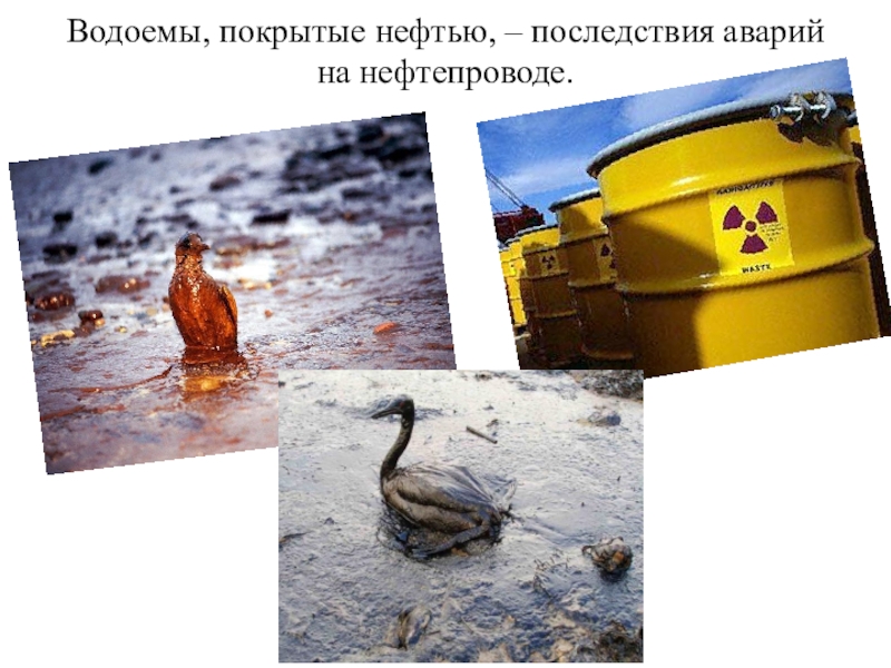 Слайд 13Водоемы, покрытые нефтью, – последствия аварий на нефтепроводе.
