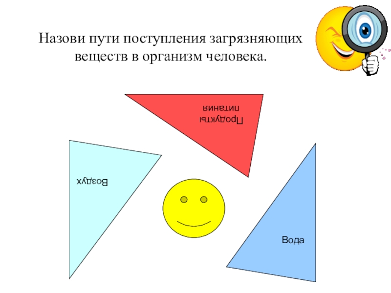 Слайд 19Назови пути поступления загрязняющих веществ в организм человека.