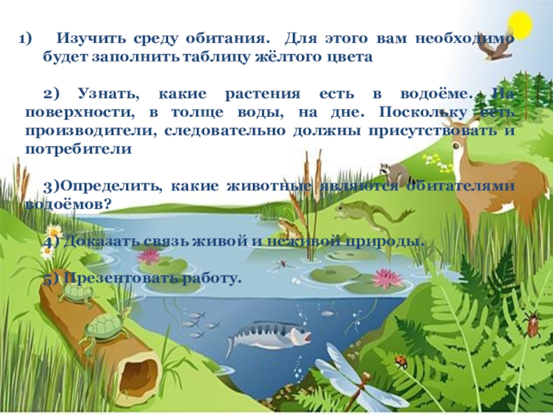 Изучить среду обитания. Для этого вам необходимо будет заполнить таблицу жёлтого цвета2) Узнать, какие растения есть