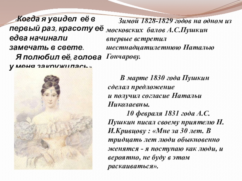 10 февраля 1831 года А.С.Пушкин писал своему приятелю Н.И.Кривцову : «Мне за 30 лет. В тридцать лет люди обыкновенно женятся - я поступаю как люди, и вероятно, не буду в этом раскаиваться».