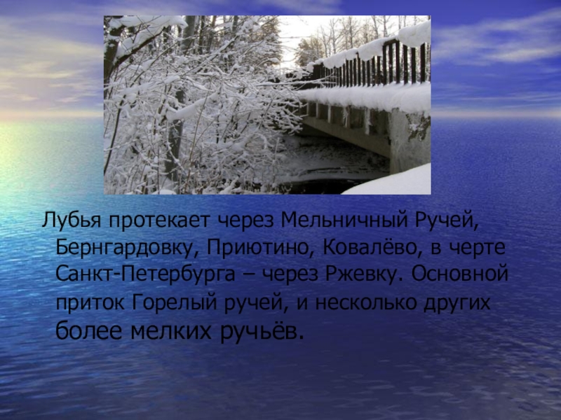 Лубья протекает через Мельничный Ручей, Бернгардовку, Приютино, Ковалёво, в черте