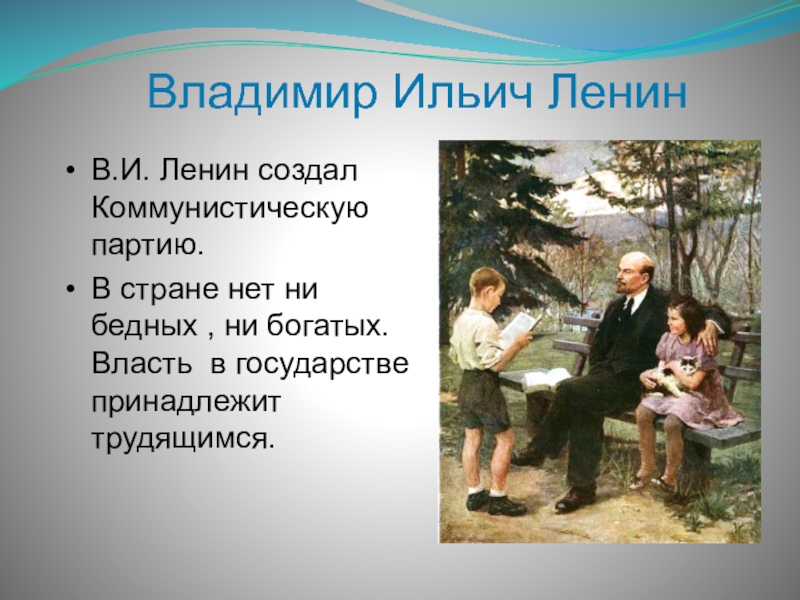 В.И. Ленин создал Коммунистическую партию.В стране нет ни бедных , ни богатых. Власть в государстве принадлежит трудящимся.