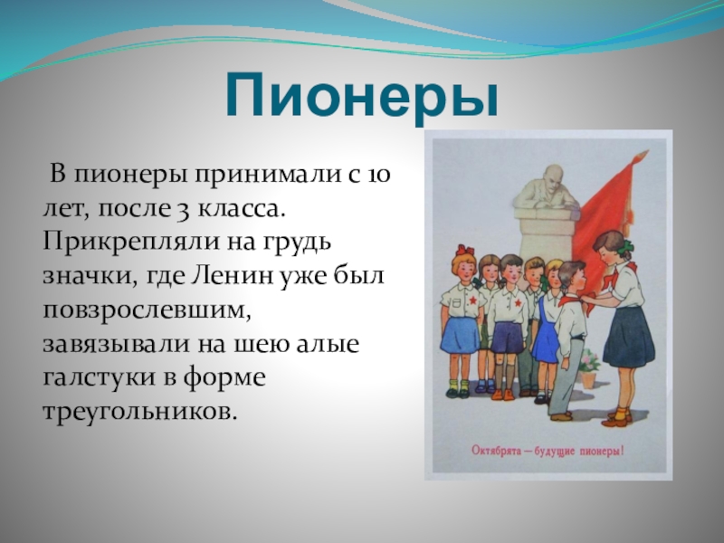 Пионеры В пионеры принимали с 10 лет, после 3 класса. Прикрепляли на грудь значки, где Ленин