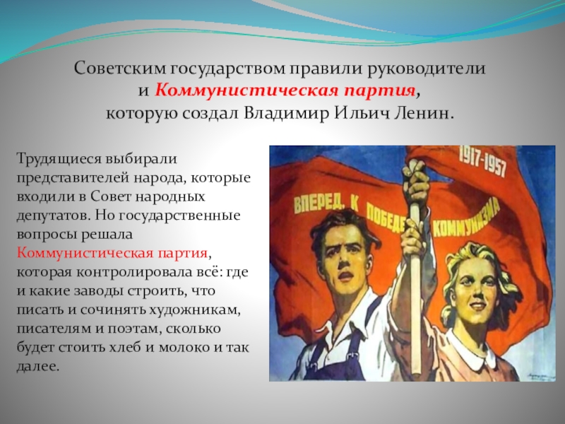 Советским государством правили руководители и Коммунистическая партия, которую создал Владимир Ильич Ленин. Трудящиеся