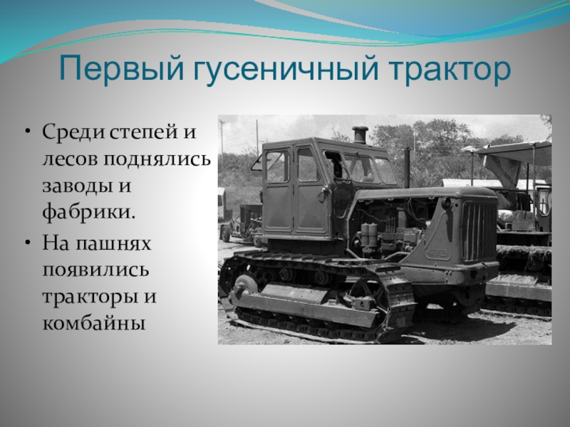 Первый гусеничный тракторСреди степей и лесов поднялись заводы и фабрики.На пашнях появились тракторы и комбайны