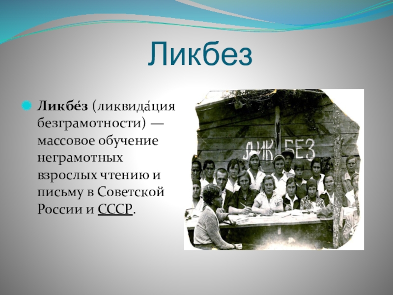 ЛикбезЛикбе́з (ликвида́ция безграмотности) — массовое обучение неграмотных взрослых чтению и письму в Советской России и СССР.