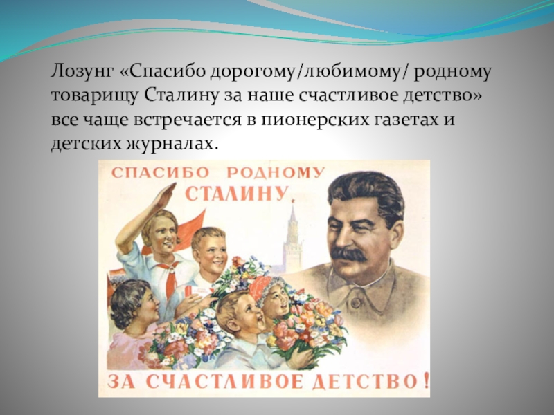 Лозунг «Спасибо дорогому/любимому/ родному товарищу Сталину за наше счастливое детство» все чаще встречается в пионерских газетах и