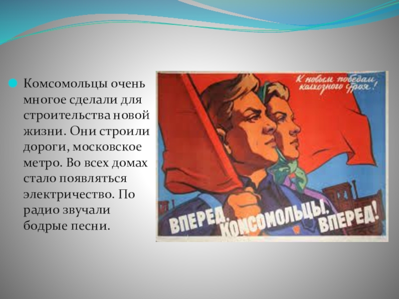 Комсомольцы очень многое сделали для строительства новой жизни. Они строили дороги, московское метро. Во всех домах стало