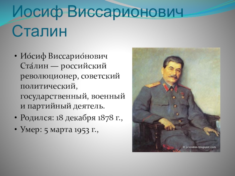 Иосиф Виссарионович СталинИо́сиф Виссарио́нович Ста́лин — российский революционер, советский политический, государственный, военный и партийный деятель. Родился: 18
