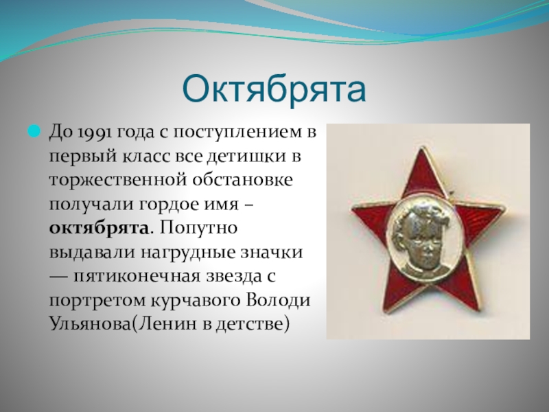 ОктябрятаДо 1991 года с поступлением в первый класс все детишки в  торжественной обстановке получали гордое имя –