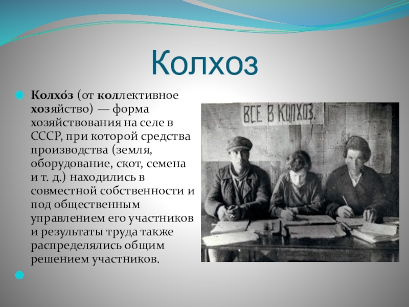 КолхозКолхо́з (от коллективное хозяйство) — форма хозяйствования на селе в СССР, при которой средства производства (земля, оборудование, скот,