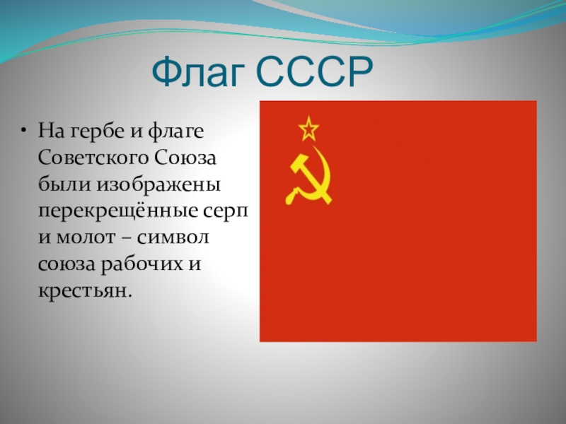 Флаг СССРНа гербе и флаге Советского Союза были изображены перекрещённые серп и молот – символ союза рабочих