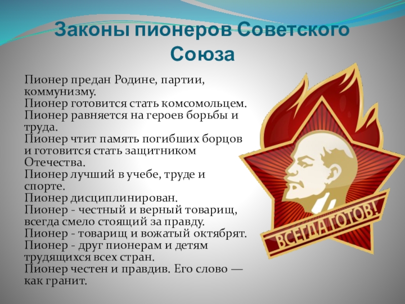 равняется на героев борьбы и труда.  Пионер чтит память погибших борцов и готовится стать защитником Отечества.  Пионер лучший в учебе, труде и спорте.  Пионер дисциплинирован.  Пионер - честный и верный товарищ, всегда смело стоящий за правду.  Пионер - товарищ и вожатый октябрят.  Пионер - друг пионерам и детям трудящихся всех стран.  Пионер честен и правдив. Его слово — как гранит.