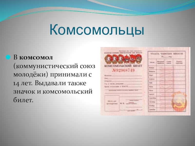 В комсомол (коммунистический союз молодёжи) принимали с 14 лет. Выдавали также