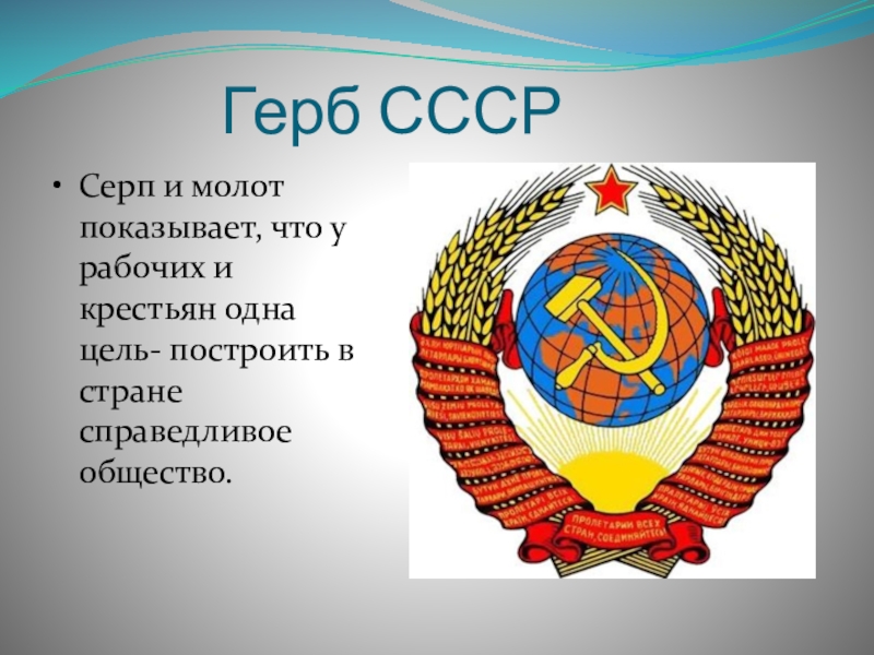 Герб СССРСерп и молот показывает, что у рабочих и крестьян одна цель- построить в стране справедливое общество.