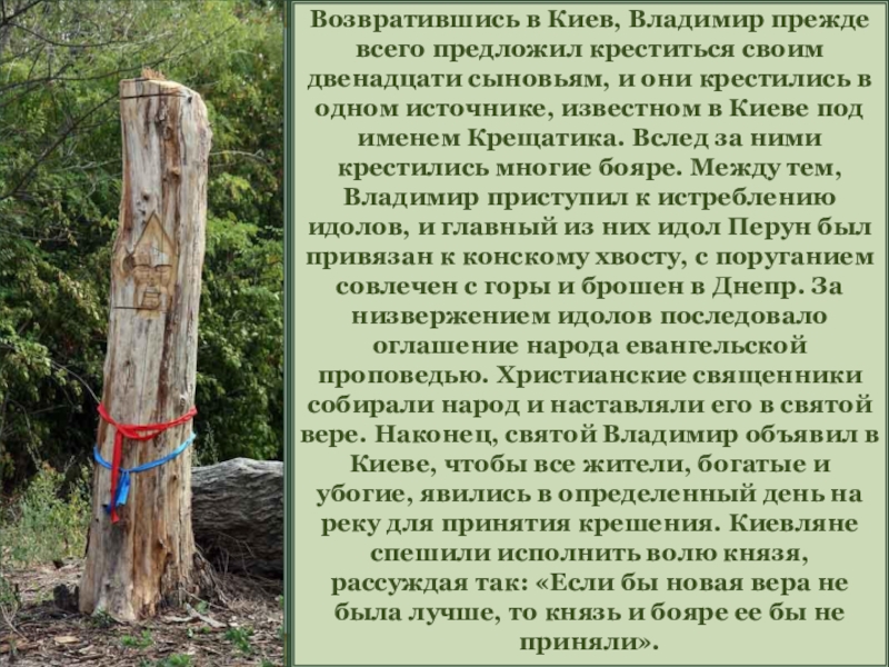 и они крестились в одном источнике, известном в Киеве под именем Крещатика. Вслед за ними крестились многие бояре. Между тем, Владимир приступил к истреблению идолов, и главный из них идол Перун был привязан к конскому хвосту, с поруганием совлечен с горы и брошен в Днепр. За низвержением идолов последовало оглашение народа евангельской проповедью. Христианские священники собирали народ и наставляли его в святой вере. Наконец, святой Владимир объявил в Киеве, чтобы все жители, богатые и убогие, явились в определенный день на реку для принятия крешения. Киевляне спешили исполнить волю князя, рассуждая так: «Если бы новая вера не была лучше, то князь и бояре ее бы не приняли».