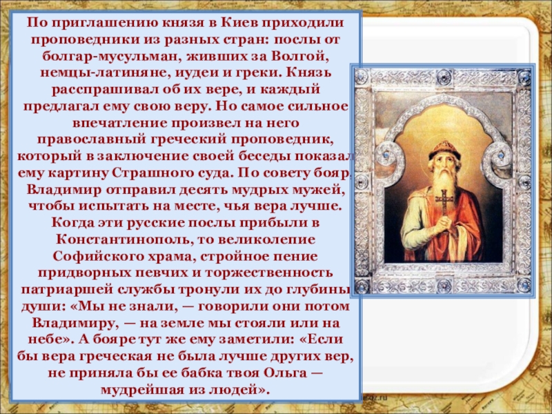 от болгар-мусульман, живших за Волгой, немцы-латиняне, иудеи и греки. Князь расспрашивал об их вере, и каждый предлагал ему свою веру. Но самое сильное впечатление произвел на него православный греческий проповедник, который в заключение своей беседы показал ему картину Страшного суда. По совету бояр, Владимир отправил десять мудрых мужей, чтобы испытать на месте, чья вера лучше. Когда эти русские послы прибыли в Константинополь, то великолепие Софийского храма, стройное пение придворных певчих и торжественность патриаршей службы тронули их до глубины души: «Мы не знали, — говорили они потом Владимиру, — на земле мы стояли или на небе». А бояре тут же ему заметили: «Если бы вера греческая не была лучше других вер, не приняла бы ее бабка твоя Ольга — мудрейшая из людей».