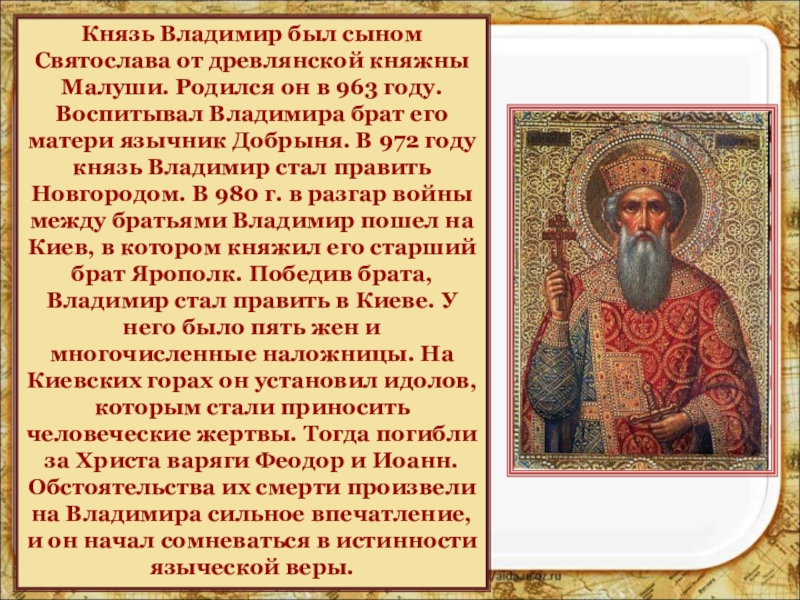 в 963 году. Воспитывал Владимира брат его матери язычник Добрыня. В 972 году князь Владимир стал править Новгородом. В 980 г. в разгар войны между братьями Владимир пошел на Киев, в котором княжил его старший брат Ярополк. Победив брата, Владимир стал править в Киеве. У него было пять жен и многочисленные наложницы. На Киевских горах он установил идолов, которым стали приносить человеческие жертвы. Тогда погибли за Христа варяги Феодор и Иоанн. Обстоятельства их смерти произвели на Владимира сильное впечатление, и он начал сомневаться в истинности языческой веры.