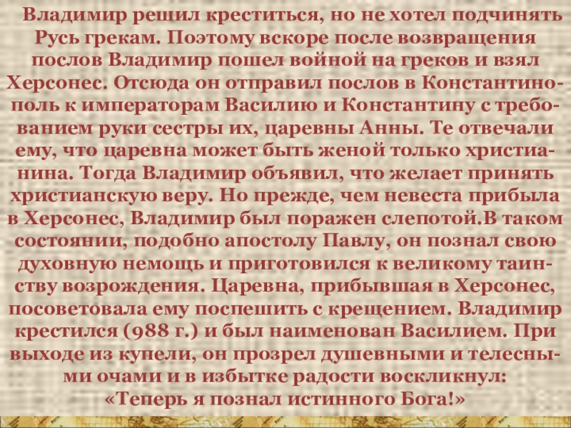 нина. Тогда Владимир объявил, что желает принять христианскую веру. Но прежде, чем невеста прибыла в Херсонес, Владимир был поражен слепотой.В таком состоянии, подобно апостолу Павлу, он познал свою духовную немощь и приготовился к великому таин-ству возрождения. Царевна, прибывшая в Херсонес, посоветовала ему поспешить с крещением. Владимир крестился (988 г.) и был наименован Василием. При выходе из купели, он прозрел душевными и телесны-