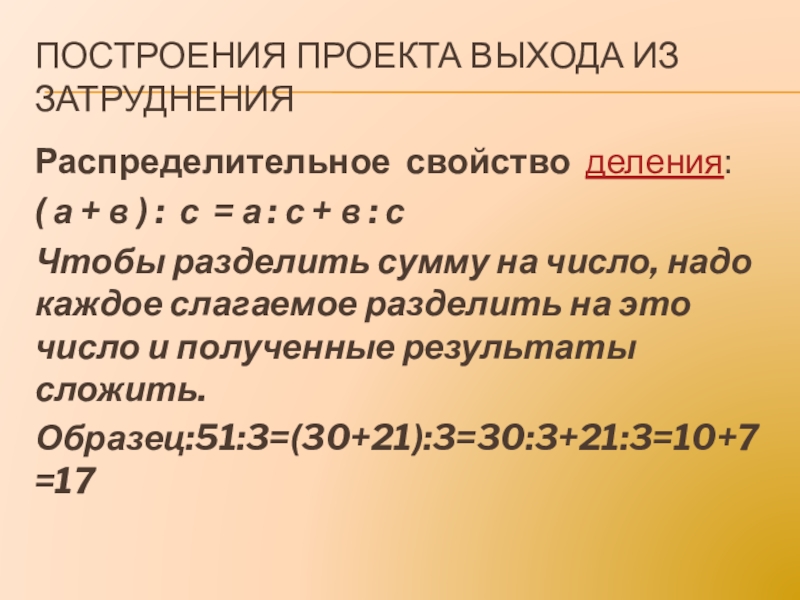Образец:51:3=(30+21):3=30:3+21:3=10+7=17