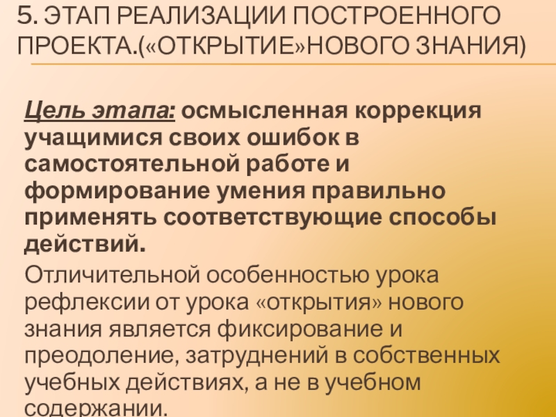Отличительной особенностью урока рефлексии от урока «открытия» нового знания является фиксирование и преодоление, затруднений в собственных учебных действиях, а не в учебном содержании.