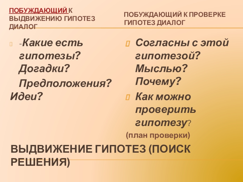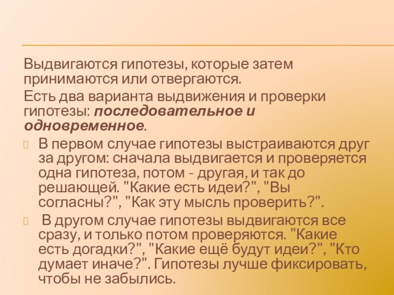 В первом случае гипотезы выстраиваются друг за другом: сначала выдвигается и проверяется одна гипотеза, потом - другая, и так до решающей. "Какие есть идеи?", "Вы согласны?", "Как эту мысль проверить?".