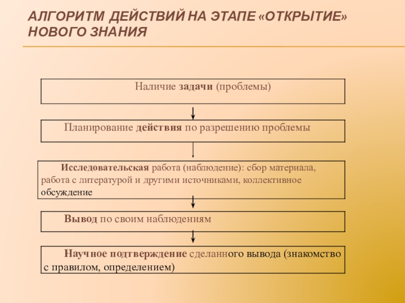 Слайд 21Алгоритм действий на этапе «открытие» нового знания
