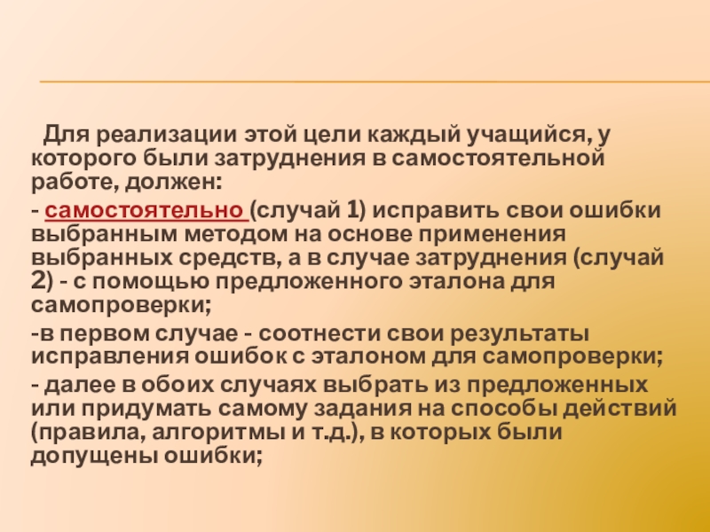 - самостоятельно (случай 1) исправить свои ошибки выбранным методом на основе применения выбранных средств, а в случае затруднения (случай 2) - с помощью предложенного эталона для самопроверки;