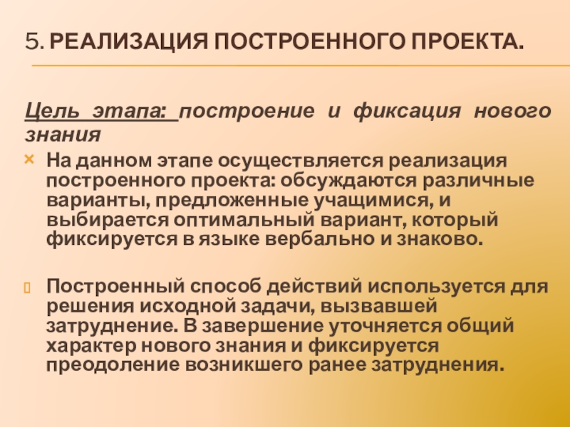 этапе осуществляется реализация построенного проекта: обсуждаются различные варианты, предложенные учащимися, и выбирается оптимальный вариант, который фиксируется в языке вербально и знаково.