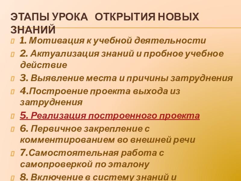 Слайд 65. Этап реализации построенного проекта.(«открытие»нового знания)