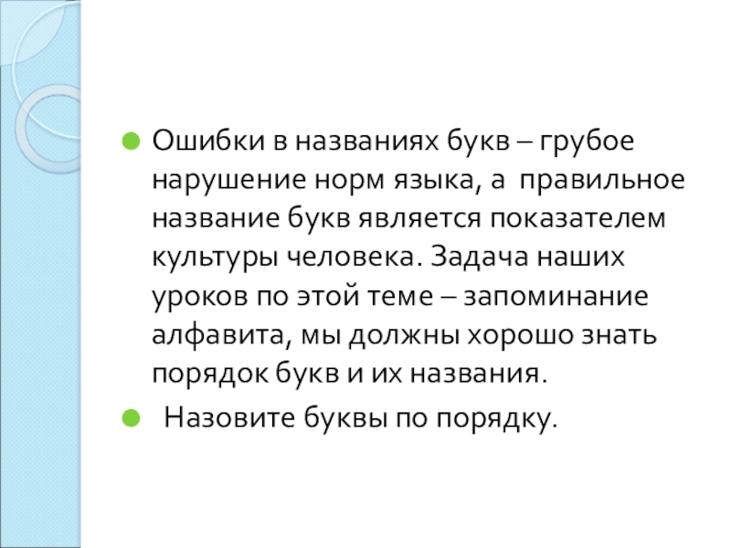 название букв является показателем культуры человека. Задача наших уроков по этой теме – запоминание алфавита, мы должны хорошо знать порядок букв и их названия.
