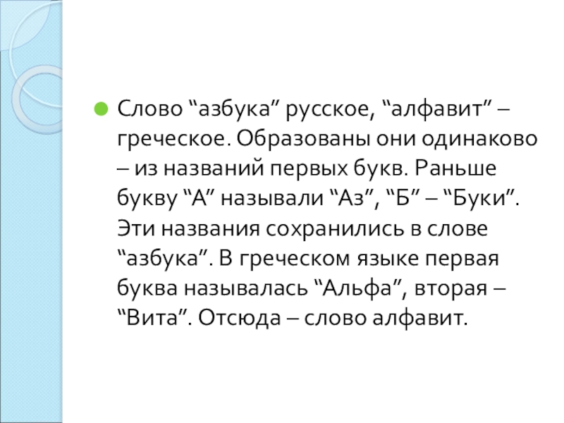 названий первых букв. Раньше букву “А” называли “Аз”, “Б” – “Буки”. Эти названия сохранились в слове “азбука”. В греческом языке первая буква называлась “Альфа”, вторая –  “Вита”. Отсюда – слово алфавит.