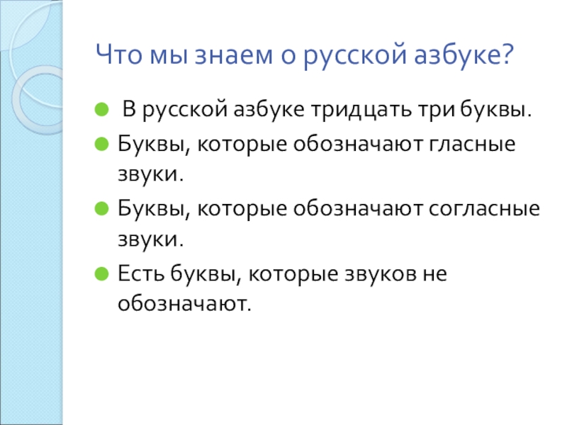 Что мы знаем о русской азбуке? В русской азбуке тридцать три буквы.Буквы, которые обозначают гласные звуки.Буквы, которые
