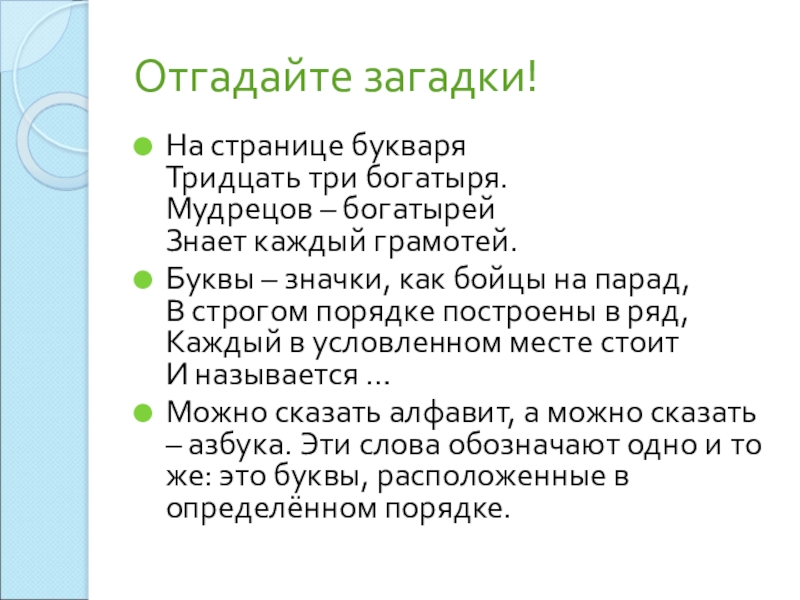 Отгадайте загадки!На странице букваря Тридцать три богатыря. Мудрецов – богатырей Знает каждый грамотей. Буквы – значки, как